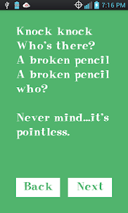 Step up to our door and see who's behind it, with corny knock knock jokes suitable for all the family. Use our list of dirty names, found in the dirty jokes section, to create your own dirty knock knock joke. Well you have to admit it. Enjoy our top 10 dirty knock knock jokes for young adults! This app works offline as well so you don't have to be connected to the internet.
